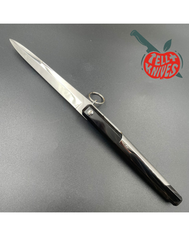 La très grande lame en acier inox de 13cm de longueur est au bénéfice d'une finition miroir, et elle se replie dans son manche en corne de buffle.