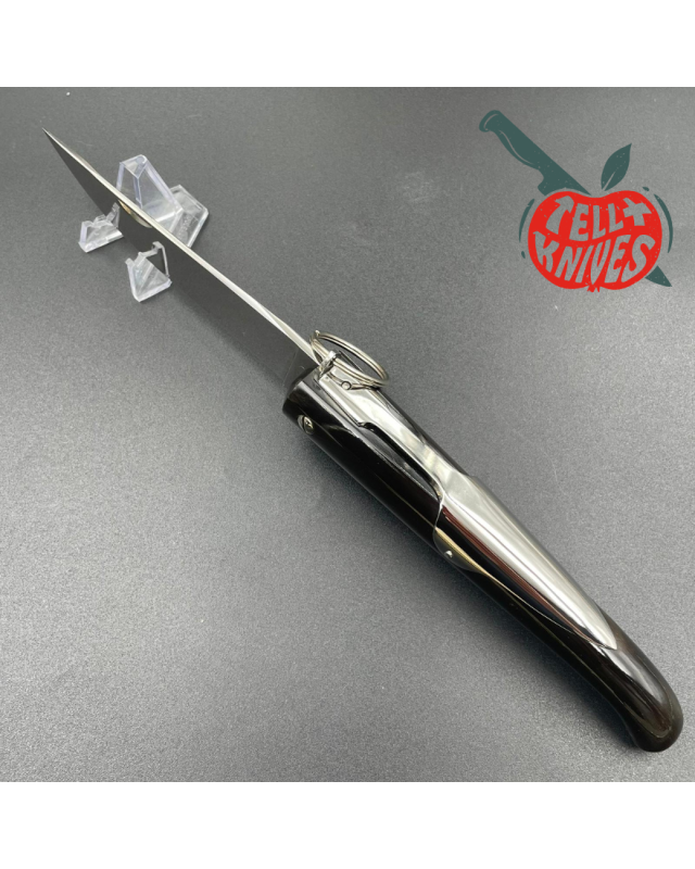 La grande lame en acier inox de 11cm de longueur est au bénéfice d'une finition miroir, et elle se replie dans son manche en corne noire, de vache française, bien évidemment.