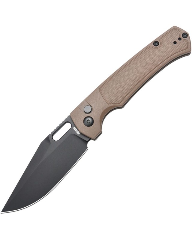Le couteau de poche EDC Artisan Cutlery Revel AR-RPM9 steel black PVD coated blade Button Lock Brown FRN handle propose une belle polyvalence pour une utilisation quotidienne ainsi qu'une bonne prise en main. De plus, il utilise un nouvel acier à outils AR-RPM9 très prometteur et qui semble remplacer avantageusement l'acier D2, d'après CJRB.