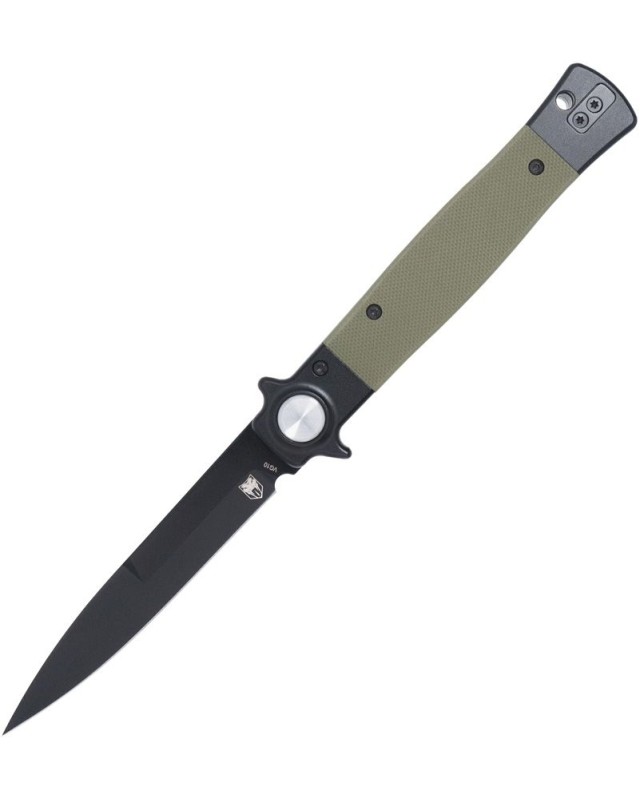 Couteau pliant de poche de type stiletto italien Cobratec Knives Stiletto VG-10 steel black finish Button Lock Black OD Green G10 handle Switzerland Legal.