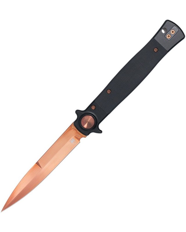 Couteau pliant de poche de type stiletto italien Cobratec Knives Stiletto VG-10 steel rose TiNi finish Button Lock Black G10 handle Switzerland Legal.