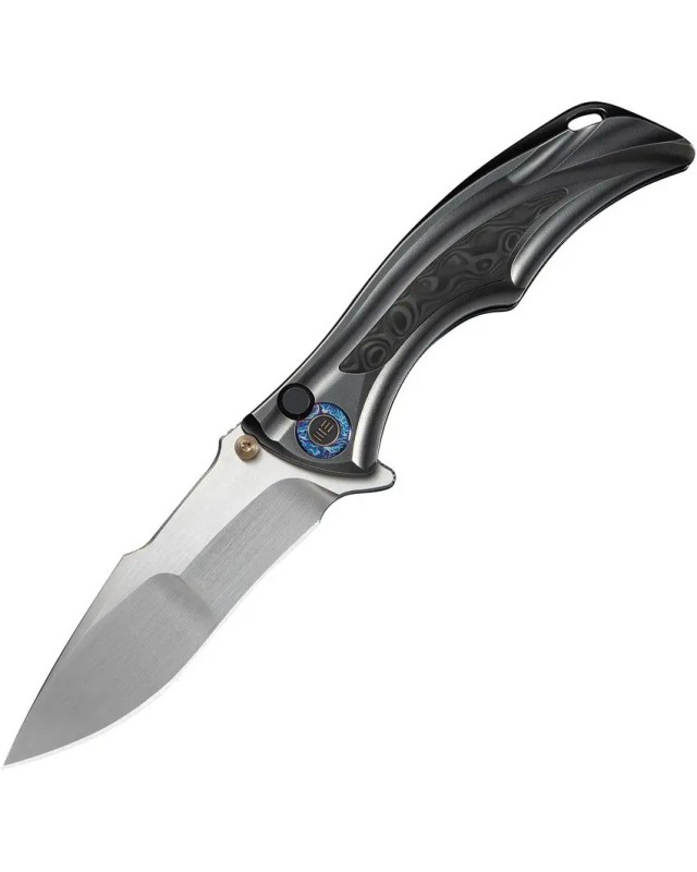 Couteau pliant de poche EDC WE KNIFE Co. Tighe Knife Satin Bohler M390 Blade Polished Gray Titanium Integral Handle Carbon Fiber Inlay Button Lock.
