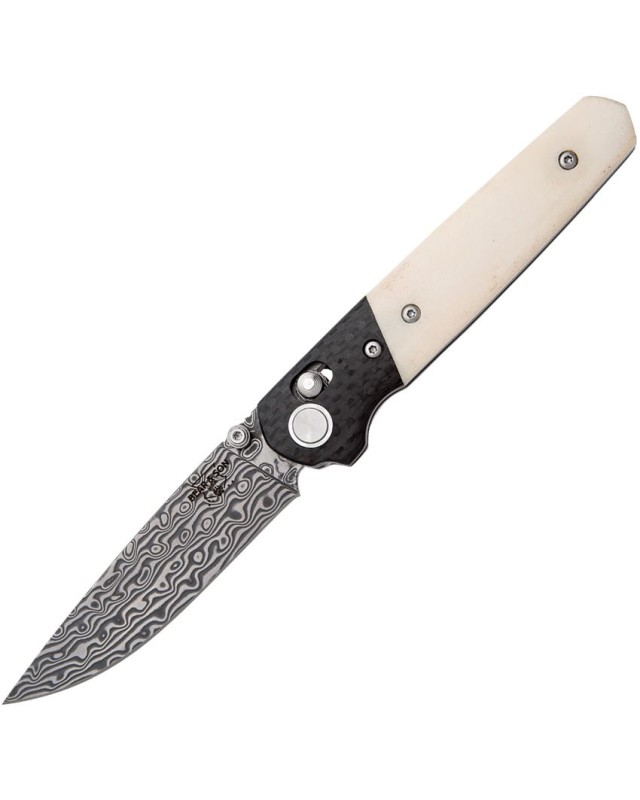 Couteau pliant gentleman folder EDC de poche Bear & Son Lawman Damascus blade Slidelock CF bolsters White Bone handle.
