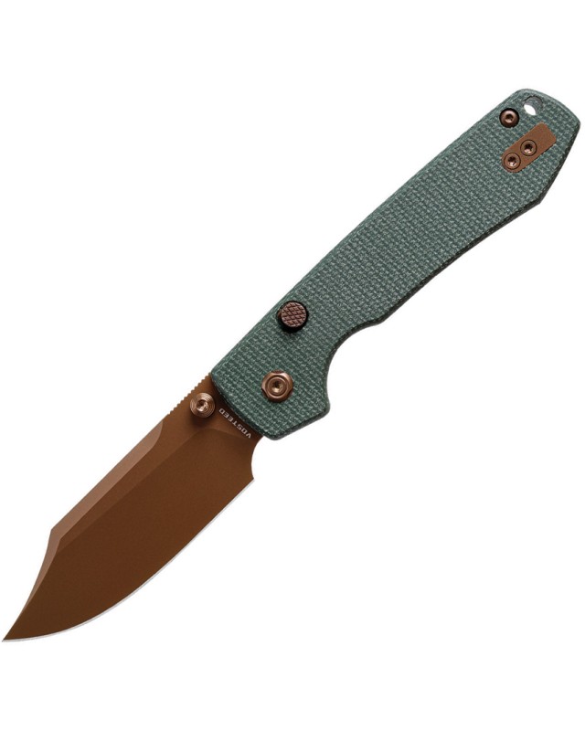 Alliant robustesse et design raffiné, le couteau de poche Vosteed Raccoon Top Linerlock se distingue par son manche en micarta vert, offrant une prise en main confortable et un excellent grip, quelque soit les conditions. Sa lame bowie de 8,26 cm en acier Sandvik 14C28N, dotée d’une finition Cerakote cuivre, assure des performances de coupe optimales et une protection accrue contre la corrosion. Ce couteau de poche EDC, d’une longueur fermée de 11,13 cm, est parfaitement adapté à un usage quotidien, que ce soit pour vos aventures outdoor ou vos besoins urbains.
