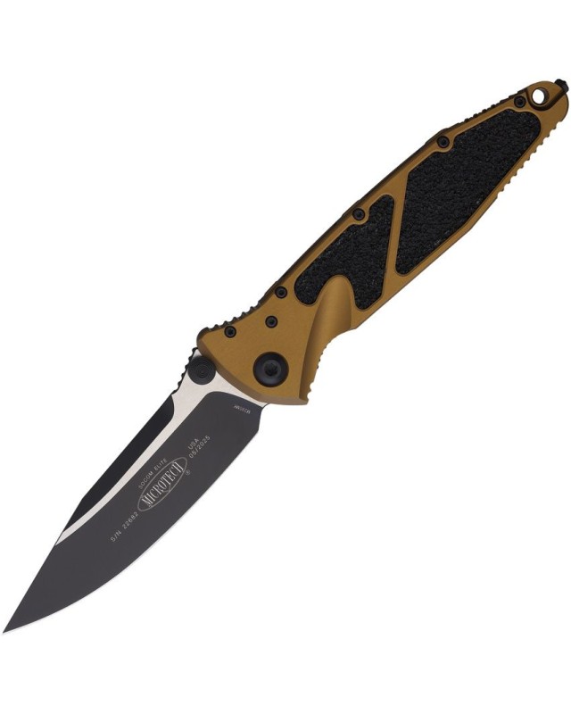 Couteau pliant de poche EDC tactique et militaire Microtech Socom Elite Tanto S\E Linerlock M390 steel Two Tone finish blade tan aluminium handle.