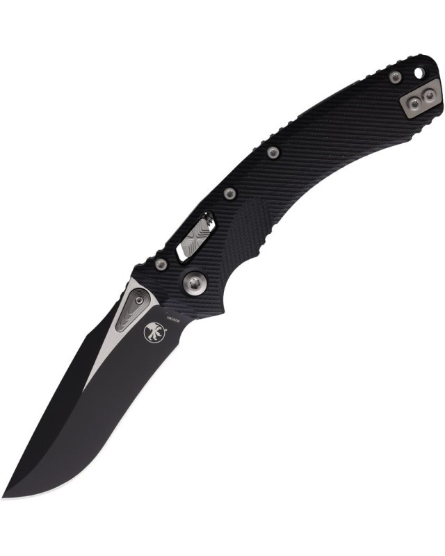 Couteau pliant de poche EDC Microtech Amphibian Ram-Lok M390MK steel two-tone finish fluted black G10 handle.