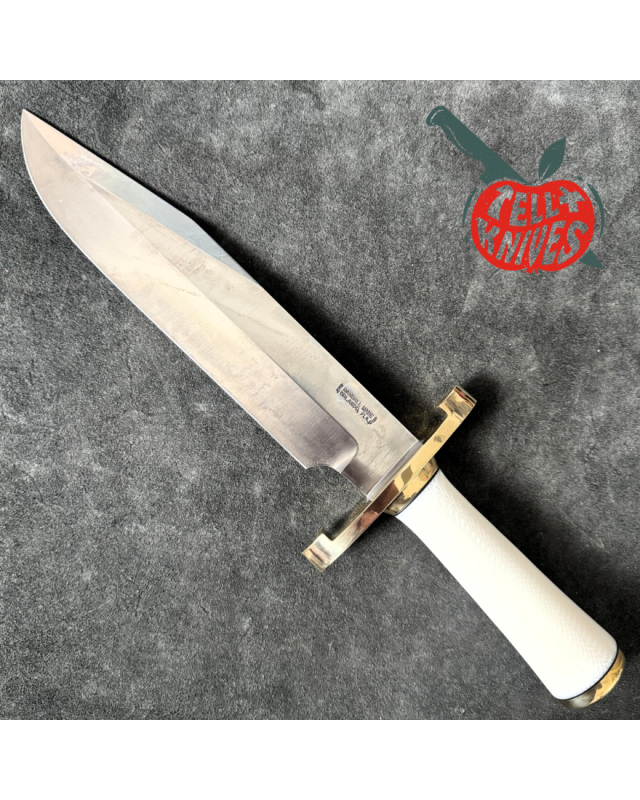 Ce modèle est un 12-9 Sportsman Bowie, avec une lame déclinée du Model 14 ; il est ici dans une déclinaison très élégante avec son manche en micarta couleur ivoire, dénommé Ivorite, une garde et pommeau en laiton, et un étui en cuir noir. L'ensemble est superbe et les couleurs s'accordent parfaitement.