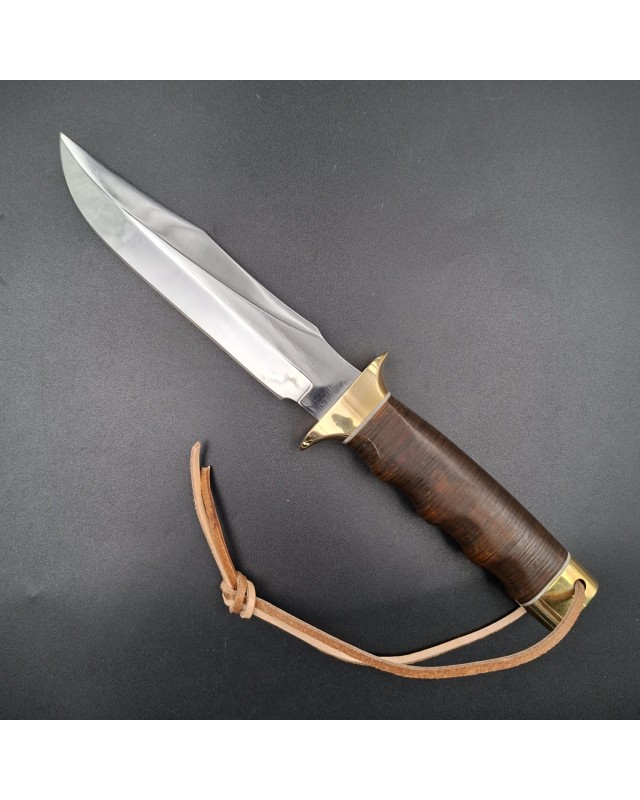 Voici un couteau fixe militaire, constitué d'une lame en acier carbone forgé à la finition miroir, montée en soie traversante vissée, sur un manche en rondelles de cuir empilées, avec intercalaire synthétique, et garde et pommeau en laiton massif, finition polie.