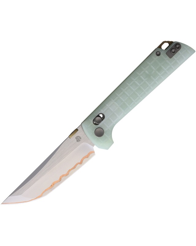 Spécifications techniques - Longueur totale fermée : 11,43 cm - Longueur totale ouverte : 20,32 cm - Longueur de lame : 8,89 cm - Type de lame : Tanto - Acier : 10Cr15CoMoV (forgé, 5 couches, avec placage cuivre) - Finition et couleur de la lame : Grise - Matière du manche : G10 - Couleur du manche : Jade.