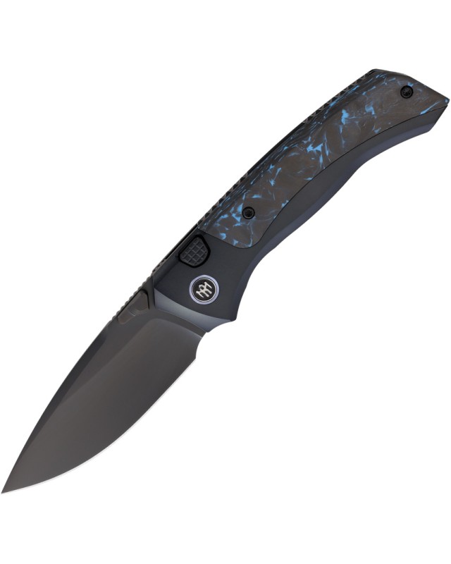 Le manche combine : de la fibre de carbone, pour le côté esthétique, du titane (effet mat grâce à la finition sablée) pour la structure et la robustesse, et une couche de placage en titane qui confère une protection supplémentaire. Le manche épouse également parfaitement la main grâce à son design ergonomique (12,2 cm de longueur, 13,3 mm d’épaisseur, 36 mm de largeur), tandis que ses teintes noir et bleu apportent une touche d’élégance contemporaine.