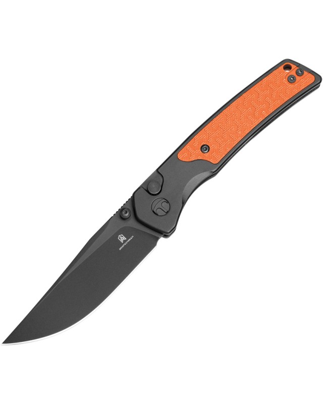 Son manche en aluminium noir mat et sublimé par une incrustation G10 orange flash, assure ergonomie, prise en main sûre ainsi qu’une rigidité structurelle très importante.