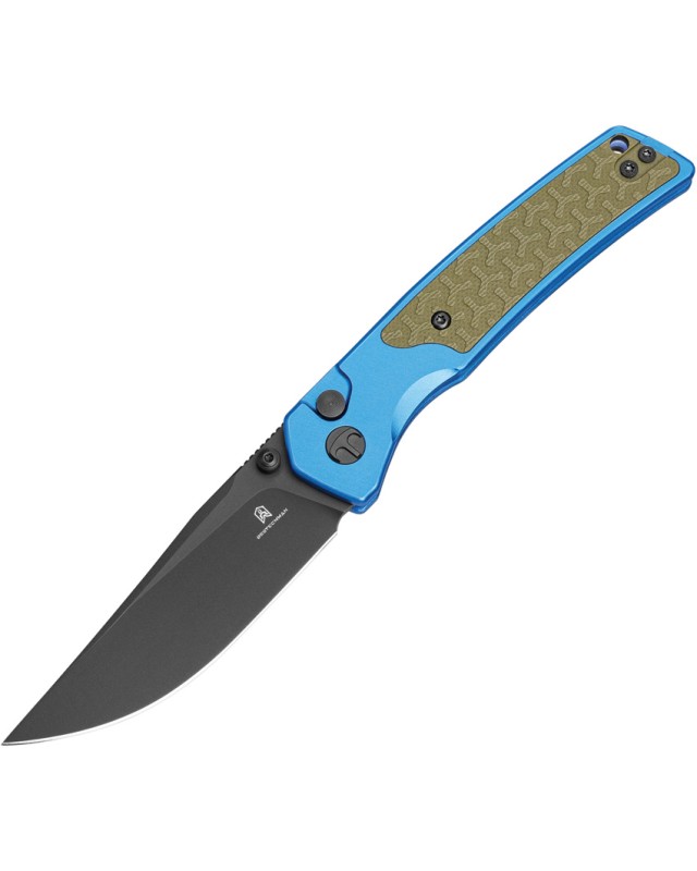 Son manche en aluminium, habillé d’une teinte bleu mat et sublimé par une incrustation G10 verte, assure ergonomie, prise en main sûre ainsi qu’une rigidité structurelle très importante.