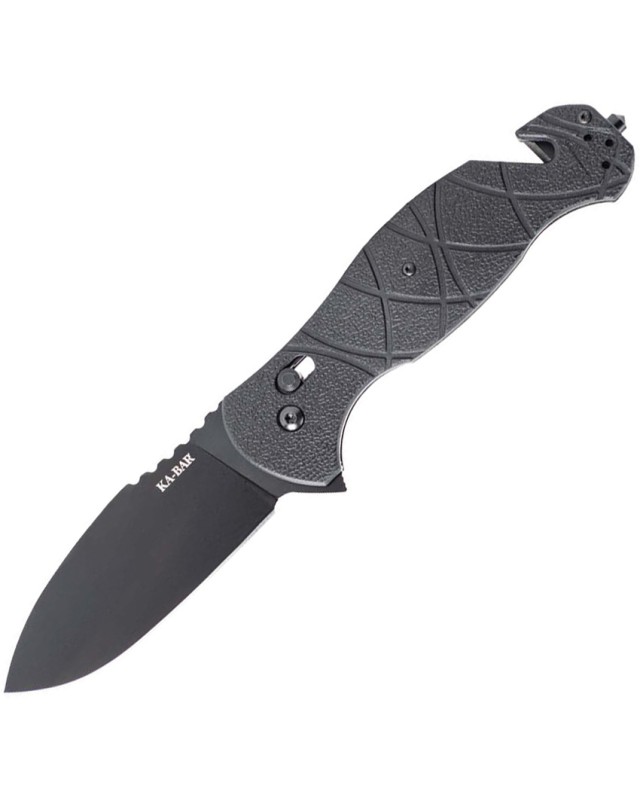 Couteau pliant de poche Ka-Bar Coytu de type tactique et militaire. Longueur totale du couteau fermé: 13,34 cm. Longueur de la lame: 8.89 cm. Lame en acier AUS-8. Finition de la lame noire. Manche en GFN noir. Coupe-ceinture/corde. Brise-verre. Bouton de pouce. Clip de poche. Traverse allongée.