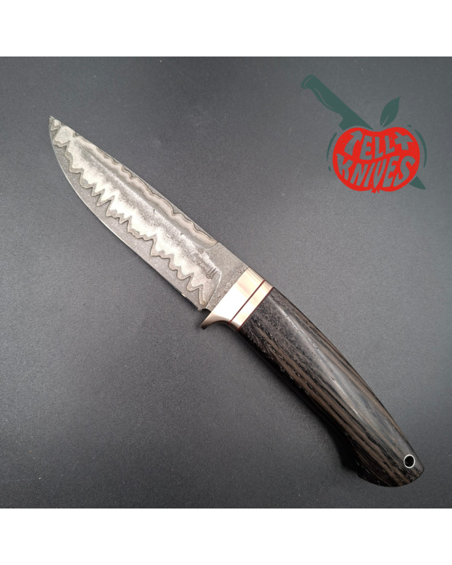 Sergey nous propose encore une pièce hors normes, avec un Damas en ... acier de char russe, abattu en Ukraine ! Oui vous avez bien lu : le coeur de cet acier Damas provient d'une machine de guerre russe. En fait il s'agit d'une goupille de chenille, ayant été démontée puis forgée avec d'autres aciers afin de produire ce Damas hallucinant.