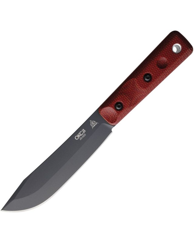Couteau de camp, couteau fixe de forêt et de bushcraft Ontario Knife Co XL Hunter Fixed Blade Full Tang black coated 1095HC carbon steel Red Canvas Micarta handle brown leather sheath Made by TOPS Knives.