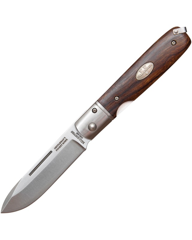 Couteau pliant de poche EDC Fallkniven GP. Longueur du couteau fermé 10cm. Lame de 7.6cm en acier laminé au Cobalt, finition satin. Selon la version, plaquettes en bois de fer, micarta noir, os, corne ou bois de fer. Logo incrusté dans le manche. Livré dans une boîte noire avec logo doré de la marque. Le couteau de Gentleman Fallkniven GP est un très beau modèle, élégant mais construit de manière extrêmement robuste. Il donnera satisfaction à son heureux propriétaire, tant par son efficacité que par son visuel.