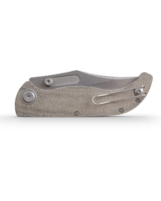 Couteau pliant de poche EDC Vosteed Naga S35VN steel stonewash finish button lock green micarta handle bowie blade.