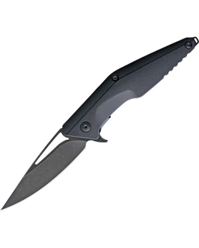 Brous Blades Division Linerlock D2 tool steel Acid Wash finish Spear Point blade Black polymer handle Flipper