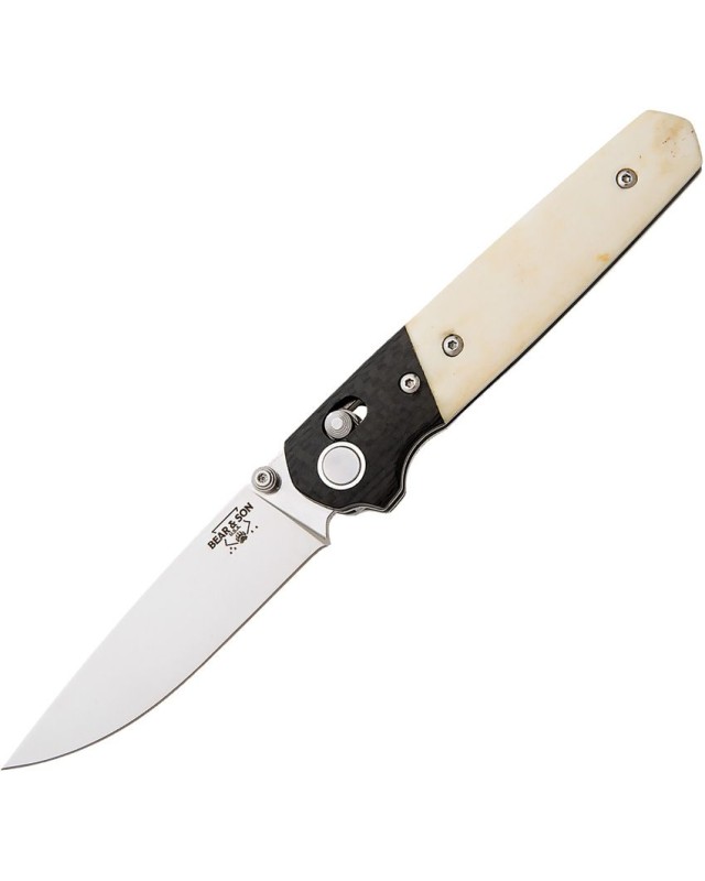 Couteau pliant gentleman folder EDC de poche Bear & Son Lawman D2 tool steel blade Slidelock CF bolsters White Bone handle.
