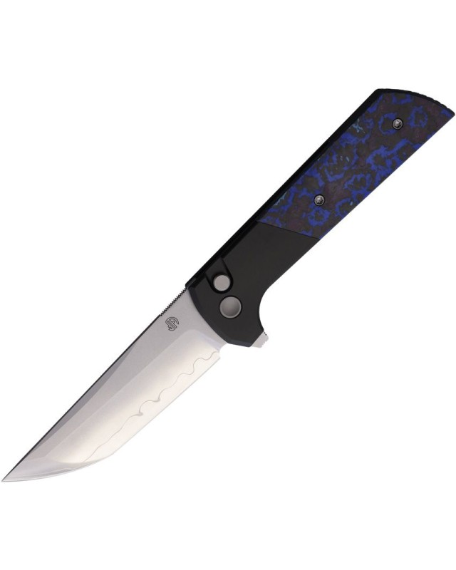 Le manche du couteau est en aluminium noir et plaquettes en fibre de carbone bleu et noir, discret et élégant !