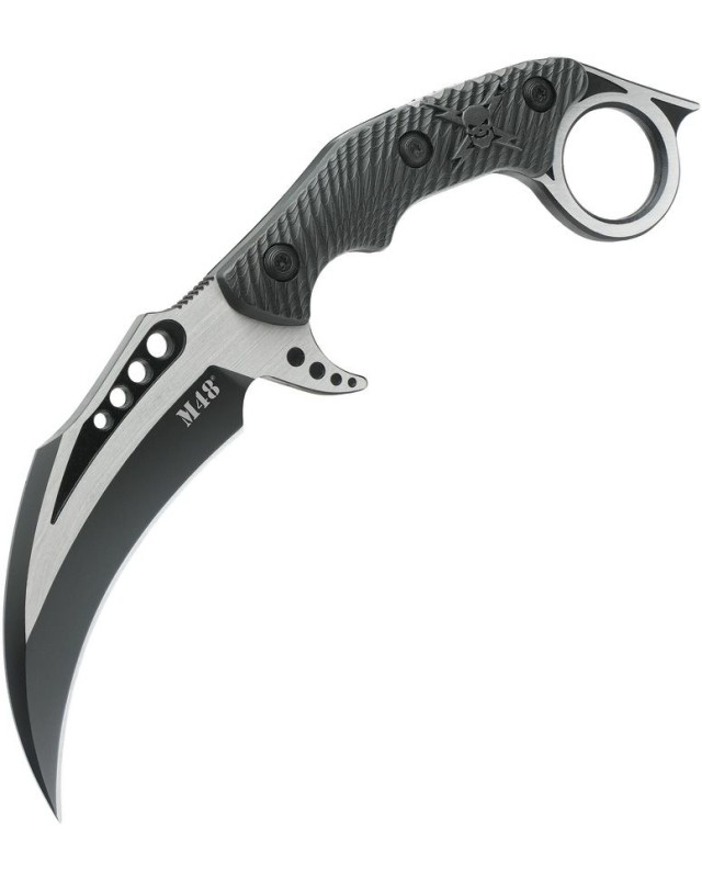 Couteau fixe United Cutlery M48 Liberator Falcon Karambit Full tang stainless steel two tone finish blade black rubber handle nylon sheath.