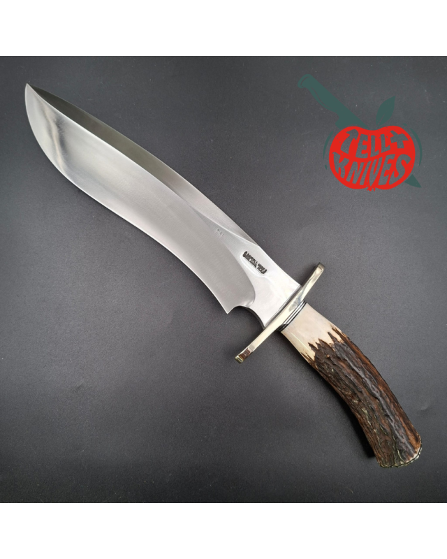 Dans cette configuration classe et relativement discrète (mais comment être discret lorsque l'on est un couteau de 40cm de long et qui affiche 800gr sur la balance ... ?!), on peut admirer la courbe de son immense lame, le haut degré de finition de l'ensemble, la beauté des dessins du bois de cerf et l'ajustement millimétré de la plaque en Nickel Silver au pommeau. Une véritable oeuvre d'art ... qui coupe !